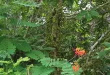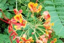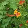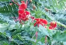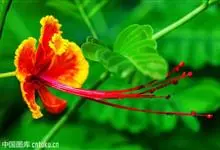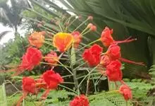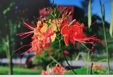 洋金凤 Sw.),豆科小凤花属灌木状或小乔木植物,枝无毛,绿或粉绿色;二回羽状复叶;总状花序伞房状,萼片无毛,花瓣橙红或黄色,圆形,花丝红色,子房无毛,花柱橙黄色;荚果窄而薄,…全部>>