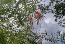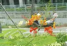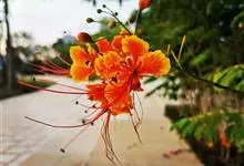 洋金凤 Sw.),豆科小凤花属灌木状或小乔木植物,枝无毛,绿或粉绿色;二回羽状复叶;总状花序伞房状,萼片无毛,花瓣橙红或黄色,圆形,花丝红色,子房无毛,花柱橙黄色;荚果窄而薄,…全部>>
