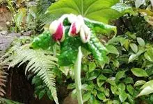 八角莲 M. Cheng)小檗科鬼臼属的多年生草本。植株高40~150厘米;根状茎直立,不分枝,无毛,淡绿色;叶互生,薄纸质,呈盾状,叶脉明显隆起,边缘有细齿;花深红色,5~8朵簇生于叶下方,下垂,…全部>>
