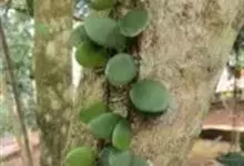 伏石蕨是水龙骨科、伏石蕨属小型附生蕨类植物。根状茎细长横走,淡绿色,疏生鳞片粗筛孔,两侧不规则分叉。叶远生,二型;叶片近球圆形或卵圆形,基部圆形或阔楔形,全缘;能育叶狭缩成舌状或狭披针形,叶脉网状,…全部>>
