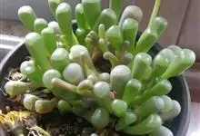 筒叶花月,是景天科青锁龙属的多年生草本植物。植株多分株,灌木状,茎较粗壮,圆柱形,表皮灰褐色;叶片肉质,互生,呈圆筒状,簇生于茎或分枝顶端,叶端呈斜截形,截面为椭圆形;花呈星状,淡白色;花期秋季。…全部>>