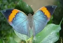 枯叶蛱蝶,又名木叶蝶、树叶蝶等,属于蛱蝶科。翅正面黑褐色,具深蓝色光泽,前翅顶角尖出,顶区有1枚小白点,中部有1条倾斜的橙色斑带,从前缘延伸至Cu室外缘,u室中部有1枚黑色圆斑,…全部>>