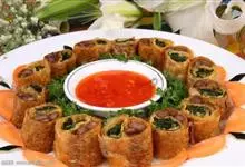 腐皮卷素菜是一道广东省的传统名菜,属于粤菜系。把香菇用清水浸软,去蒂,切细丝,胡萝卜,榨菜分别洗净,切细丝,豆芽,韭黄分别洗净,韭黄切段。用2汤匙油爆香姜丝,胡萝卜,榨菜,放入香菇同炒透,将豆芽放入…全部>>