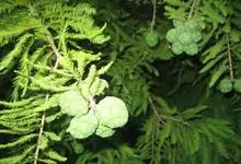 落羽杉 Rich.),杉科落羽杉属木本植物。树干尖削度大,基部通常膨大,具膝状呼吸根,树皮棕色,裂成长条片;一年生小枝褐色,侧生短枝;叶线形;球果具短柄,熟时淡褐黄色,被白粉;花期3月;球果10月成熟。…全部>>