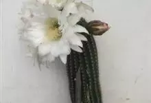 仙人球花 仙人掌科,仙人球属。植株单生或成丛。幼株球形,老株长成圆筒状,高可达75厘米,直径12-15厘米。球体暗绿色,具棱11-12。刺锥状,黑色,长1-1.5厘米。花着生于球体侧方,大型嗽喇叭状…全部>>