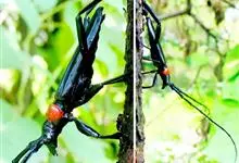 桃红颈天牛是天牛科、颈天牛属昆虫。体黑色发亮,前胸背面大部分为光亮的棕红色或完全黑色。头黑色,腹面有许多横皱,头顶部两眼间有深凹。触角蓝紫色,前胸背面前后缘呈黑色并收缩下陷密布横皱。鞘翅表面光滑。…全部>>