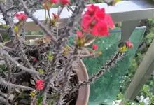 虎刺梅:别称铁海棠,是蔓生灌木植物。茎多分枝,长60-100厘米,直径5-10毫米,具纵棱,密生硬而尖的锥状刺,刺长1-1.5厘米,直径0.5-1.0 毫米,常呈3-5列排列于棱脊上,呈旋转。叶互生…全部>>