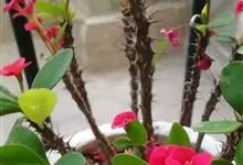 虎刺梅:别称铁海棠,是蔓生灌木植物。茎多分枝,长60-100厘米,直径5-10毫米,具纵棱,密生硬而尖的锥状刺,刺长1-1.5厘米,直径0.5-1.0 毫米,常呈3-5列排列于棱脊上,呈旋转。叶互生…全部>>