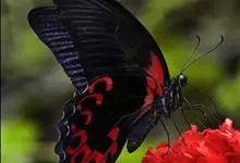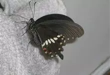 玉斑凤蝶Papilio helenus 别名白纹凤蝶,是凤蝶科凤蝶属美凤蝶亚属大型种类。雌雄同型;体翅皆黑色,后翅正面中室外有3个并列的白色斑,亚外缘有1列模糊的新月形红色斑,…全部>>