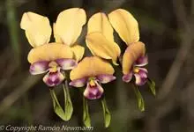 湿唇兰 Pfitz.):茎粗壮,长被宿存的叶鞘所包,上部具3-5枚叶。叶长圆形或倒卵状长圆形。花序1-6个,长达35厘米;疏生5-8朵花;花大,稍肉质,萼片和花瓣黄色带暗紫色斑点;萼片近相似,…全部>>