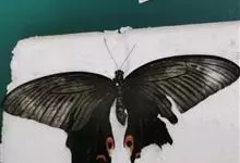 玉斑凤蝶Papilio helenus 别名白纹凤蝶,是凤蝶科凤蝶属美凤蝶亚属大型种类。雌雄同型;体翅皆黑色,后翅正面中室外有3个并列的白色斑,亚外缘有1列模糊的新月形红色斑,…全部>>