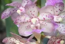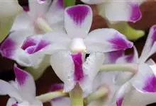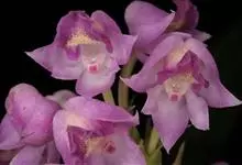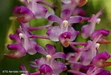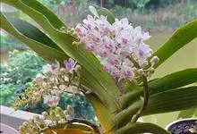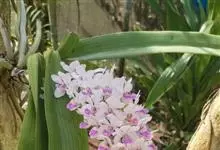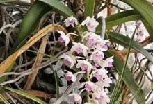 指甲兰是兰科指甲兰属植物。其茎粗壮;叶带状;总状花序疏生数朵花;萼片和花瓣淡白色,上部具紫红色;唇瓣侧裂片镰状长圆形;中裂片近宽卵形,前半部紫色,后半部白色带紫色斑点和条纹,先端凹缺,…全部>>