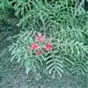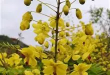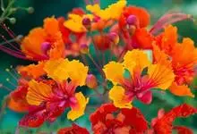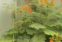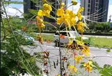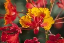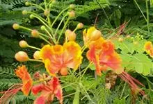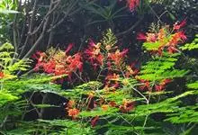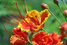 洋金凤 Sw.),豆科小凤花属灌木状或小乔木植物,枝无毛,绿或粉绿色;二回羽状复叶;总状花序伞房状,萼片无毛,花瓣橙红或黄色,圆形,花丝红色,子房无毛,花柱橙黄色;荚果窄而薄,…全部>>