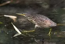紫背苇鳽是鹭科、苇鳽属动物,为涉禽,体长约33厘米。头顶黑色,后头至尾上覆羽暗栗褐色;翅上覆羽橄榄黄色;下体浅棕黄色。多生活于水库和山脚边的稻田、芦苇丛、滩涂及沼泽草地,在西藏见于海拔2300米的农田,…全部>>