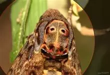 鬼脸天蛾,是鳞翅目天蛾科面形天蛾属动物。成虫翅展100~125毫米,体黑褐色;胸背有骷髅形斑纹;卵圆球形,直径约2毫米,淡黄绿色,表面光滑;老熟幼虫体长70~90毫米,蛹体长约56毫米;前翅为褐色,…全部>>