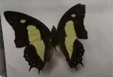 大二尾蛱蝶两翅正面黑色,中域有一浅绿色大型宽带纹,两翅反面浅绿色,中域有一缀黑边的褐色弧纹,亚外缘还有一深褐色横纹,后翅各有尾突两条,…全部>>