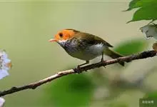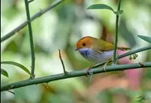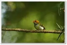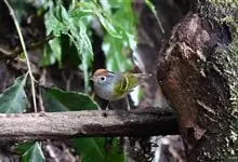棕脸鹟莺:体长10厘米,是一种色彩亮丽而有特色的莺鸟。头栗色,具黑色侧冠纹。上体绿,腰黄色。下体白,颏及喉杂黑色点斑,上胸沾黄。与栗头鹟莺的区别在头侧栗色,白色眼圈不显著且无翼斑。…全部>>