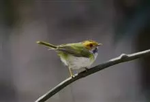 黑脸鹟莺:体长10厘米,是有特色的体小而多彩的莺鸟。粗眉纹,颏、喉及尾下覆羽黄色,脸罩黑,头顶及颈背灰色,上体绿,无翼纹,腹白。虹膜褐色;上嘴色深,下嘴肉色;脚偏绿色。…全部>>