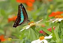 青带凤蝶Graphium sarpedon ,又名青凤蝶,是最普遍的中型凤蝶,飞行速度很快。青带凤蝶的翅膀中央有许多浅蓝色的斑点,很整齐地排列成一条直线。这些斑点由上而下逐渐变大,就像一条青色的带子。全部>>
