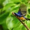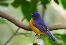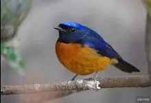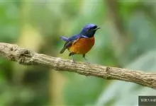 棕腹大仙鹟:体重24-28克,体长15-17厘米,是一种小型的色彩亮丽的鹟。雄鸟上体深蓝,下体棕色,脸黑,额、颈侧小块斑、翼角及腰部亮丽闪辉蓝色。与棕腹仙鹟易混淆,区别在色彩较暗。雌鸟灰褐,…全部>>
