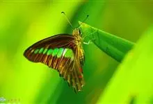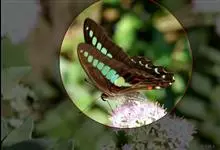 青带凤蝶Graphium sarpedon ,又名青凤蝶,是最普遍的中型凤蝶,飞行速度很快。青带凤蝶的翅膀中央有许多浅蓝色的斑点,很整齐地排列成一条直线。这些斑点由上而下逐渐变大,就像一条青色的带子。全部>>