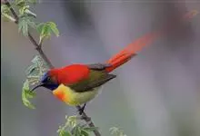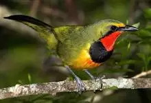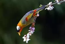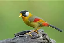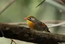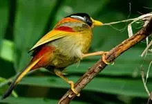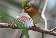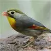 银耳相思鸟小型鸟类,体长14~18厘米。头顶黑色,耳羽银灰色,前额橙黄色;外侧飞羽橙黄色,基部朱红色,极为鲜艳、醒目。尾圆形,尾上、尾下覆羽朱红色,尾暗灰褐色,外侧尾羽橙黄色,其余上体橄榄绿或橄榄黄色。…全部>>