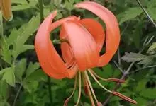 东北百合,别名卷莲花、老哇芋头、轮叶百合、伞蛋花、山丹花,为百合科、百合属多年生球根花卉。鳞茎卵圆形,白色,有节。苞片叶状,花淡橙红色,具紫红色斑点;花被片稍反卷,蒴果倒卵形,花期7-8月,果期9月,…全部>>