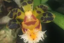 大花盆距兰 Kuntze):茎粗壮,长2-5厘米,节间长约1厘米。叶大,带状或长圆形。伞形花序侧生,通常2-3个,具4-6朵花;花大;萼片和花瓣淡黄色带棕紫色斑点,椭圆形,近相似,长12-17毫米,…全部>>
