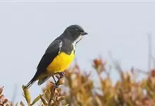 黄腹啄花鸟:体重11-16克,体长104-117毫米。是一种体型大,下腹部为艳黄色的啄花鸟,雄鸟特征为头黑色,喉部有白色纵斑、喉侧及上体成对比,两翅和尾黑色,外侧尾羽内翈具白色斑块。其余下体淡黄色。…全部>>