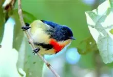 红胸啄花鸟:体重5-10克,体长60-92毫米。体形纤小。雄鸟上体呈辉亮的金属绿色;下体棕黄,胸部具一朱红色块斑,极易与其他啄花鸟区别。雌鸟上体呈橄榄绿,下体棕黄色。虹膜褐色,嘴褐黑色或角灰色,…全部>>