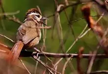 白颊噪鹛是雀形目噪鹛科噪鹛属鸟类,又称土画眉、小画眉、小噪鹃。成鸟额至头顶栗褐色,长眉纹、眼先和颊纹棕白色,眼后至耳羽深褐色,…全部>>