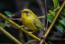 金头穗鹛小型鸟类,体长10~11厘米,是一种黄色小鸟。头顶金黄色有黑色纵纹,眼先黑色,在头、颊和耳羽金黄色的衬托下亦甚醒目。上体橄榄黄色,下体亮黄色,腹和两胁沾绿。…全部>>