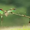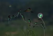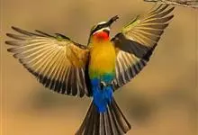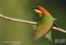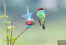 栗喉蜂虎是蜂虎科蜂虎属的鸟类。有热带鸟类羽毛艳丽的特征:喉部是栗红色的,黑色的过眼纹,翅膀和背部是绿色的,尾翼是蓝色的,飞行时翅膀下面的羽毛是橙黄色的,在阳光的照射下,它们全身闪烁着金属般的艳丽光泽,…全部>>