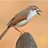 金眼鹛雀是莺科、鹛雀属小型鸟类。体长16-20厘米。头顶和上体棕褐色,两翅表面肉桂红色,尾褐色具明暗相间横斑。眼周金黄色,眼先、眼上、眼下、颊以及颏、喉和上胸概为白色,其余下体茶黄色,脚橙黄色。…全部>>