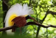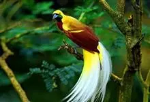 大极乐鸟是极乐鸟属中最大的鸟种。成年雄鸟体长可达到43厘米,雌性可达35厘米。雄鸟的额、颊、喉等墨绿色;头、颈黄色;上体暗赤栗色;腹部葡萄红色,胁部有长饰羽,其基部橙黄,中部黄色,…全部>>