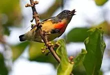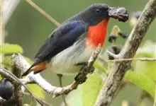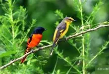 灰喉山椒鸟:共有8个亚种。体长18-22厘米。雄鸟头部和背亮黑色,腰、尾上覆羽和下体朱红色,翅黑色具一大一小的两道朱红色翼斑。中央尾羽黑色,外侧尾羽基部黑色,端部红色。…全部>>