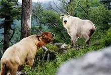 羚牛,偶蹄目牛科羚牛属哺乳动物,俗称扭角羚、野山牛、盘羊。其体形粗壮。尾短。吻鼻部隆起且裸露。前额隆起,毛短而蓬松。角基粗,由头顶长出后先向上升起,又突然翻转,靠近头部,复向外伸,然后又向后弯转,…全部>>