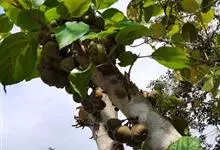 大果榕是桑科榕属的小乔木,株高可达10米;幼枝被柔毛;叶互生,宽卵状心形或近圆形;雄花无梗、匙形、花丝长,雌花生于雌株榕果内,子房白色;榕果簇生于树干基部或老茎短枝上、扁球形或陀螺形,…全部>>