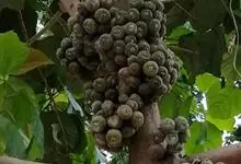 大果榕是桑科榕属的小乔木,株高可达10米;幼枝被柔毛;叶互生,宽卵状心形或近圆形;雄花无梗、匙形、花丝长,雌花生于雌株榕果内,子房白色;榕果簇生于树干基部或老茎短枝上、扁球形或陀螺形,…全部>>