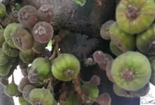 大果榕是桑科榕属的小乔木,株高可达10米;幼枝被柔毛;叶互生,宽卵状心形或近圆形;雄花无梗、匙形、花丝长,雌花生于雌株榕果内,子房白色;榕果簇生于树干基部或老茎短枝上、扁球形或陀螺形,…全部>>