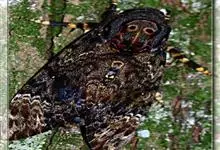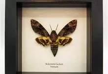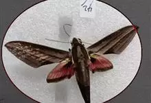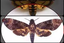 鬼脸天蛾,是鳞翅目天蛾科面形天蛾属动物。成虫翅展100~125毫米,体黑褐色;胸背有骷髅形斑纹;卵圆球形,直径约2毫米,淡黄绿色,表面光滑;老熟幼虫体长70~90毫米,蛹体长约56毫米;前翅为褐色,…全部>>