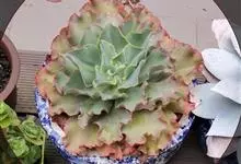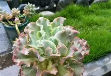 女王花笠,又名扇贝石莲花、女王花舞笠,是景天科拟石莲花属的多肉植物。由美国加利福尼亚州的育种师Dick Wright于1964年培育。特征是呈大波浪状褶皱的红色叶缘和气质高贵的粉紫色调。…全部>>