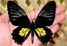 金裳凤蝶是凤蝶科、裳凤蝶属的动物。金裳凤蝶身体呈黑色,头、颈和胸侧有红毛,腹部有黑黄两色相间条纹,雄蝶前翅黑色,具黑天鹅绒光泽,各脉两侧灰白色,后翅金黄色,各室外缘有等腰三角形黑斑1枚,斑内侧有晕,…全部>>