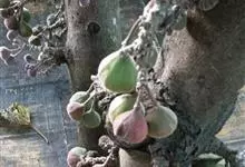 大果榕是桑科榕属的小乔木,株高可达10米;幼枝被柔毛;叶互生,宽卵状心形或近圆形;雄花无梗、匙形、花丝长,雌花生于雌株榕果内,子房白色;榕果簇生于树干基部或老茎短枝上、扁球形或陀螺形,…全部>>