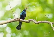 发冠卷尾是中型鸟类,体长28-35厘米。通体绒黑色缀蓝绿色金属光泽,额部具发丝状羽冠,外侧尾羽末端向上卷曲。栖息于海拔1500米以下的低山丘陵和山脚沟谷地带,多在常绿阔叶林、次生林或人工松林中活动。…全部>>