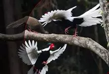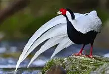 白鹇,是鸡形目雉科鹇属的一种留鸟。雄鸟上体白色并具黑色纹,下体黑色,头顶具黑色长羽冠,尾白而长;雌鸟体型较小,以橄榄褐色为主,下体具白色或皮黄色细纹;虹膜褐色,眼周具红色裸皮,喙黄色,脚鲜红色。…全部>>