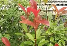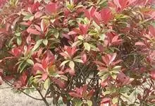 红叶石楠 是蔷薇科,石楠属杂交种,为常绿小乔木或灌木,乔木高可达5米、灌木高可达2米。叶片革质,长圆形至倒卵状、披针形,叶端渐尖,叶基楔形,叶缘有带腺的锯齿,花多而密,复伞房花序,花白色,梨果黄红色,…全部>>