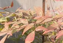 南天竹,小檗科南天竹属常绿小灌木植物,茎干较高,表面光滑无毛,红色;叶较小,叶片薄,呈椭圆形且为深绿色,无毛;花朵较小,白色带有芳香,呈四角形;果柄短且果实呈球形,橙红色;种子扁圆形。花期3-6月,…全部>>