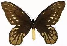 亚历山大女皇鸟翼凤蝶,又称大鸟翼蝶,是鳞翅目凤蝶科鸟翼蝶属蝴蝶;翅膀圆阔、褐色,雌性翅膀上会点缀着耀眼的白色斑纹;雄性翅膀上则闪耀着红蓝色的光泽。亚历山大女皇鸟翼凤蝶幼时很黑,身上长有红色的结节,…全部>>