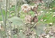 木芙蓉,锦葵科木槿属落叶灌木或小乔木。小枝上有细绒毛;叶片为卵状心形,托叶为披针形,常早落;花单生,花萼为钟形,花冠初为白色或淡红色,后逐渐变为深红色;果实为扁球形,有淡黄色的毛附着。花期8到10月。…全部>>